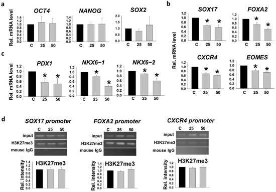 Human embryonic stem cell (hESC) cultured in hyperglycemic conditions showed disrupted pancreatic differentiation potential. (a) The relative mRNA levels of pluripotent markers (OCT4, NANOG and SOX2) in undifferentiated VAL3 under hyperglycemic conditions (C: 13.7 mM D-glucose) (n = 4). (b) The relative mRNA levels of definitive endoderm (DE) markers (SOX17, FOXA2, CXCR4 and EOMES) in DE cells from different conditions of VAL3 (n = 4, * p < 0.05 compared to control, one-way ANOVA followed by Student–Newman–Keuls). (c) The relative mRNA levels of pancreatic progenitor (PP) markers (PDX1, NKX6−1 and NKX6−2) in PP cells from different conditions of VAL3 (n = 4, * p < 0.05 compared to control, one-way ANOVA followed by Student–Newman–Keuls). (d) The H3K27me3 binding levels on the promoters of DE markers in undifferentiated VAL3 under hyperglycemic conditions (n = 3).
