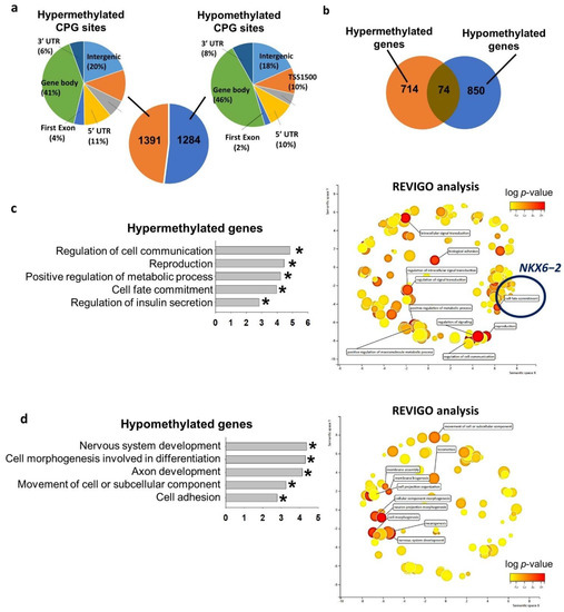 We next studied the genome-wide DNA methylomes of VAL3 cultured in control glucose (13.7 mM) and hyperglycemic (50 mM) conditions using the Infinium HumanMethylation450 BeadChip array. The analysis revealed 1391 hypermethylated cytosines followed by guanine residues (CpG) sites and 1284 hypomethylated CpG sites in the hyperglycemia-treated VAL3 when compared to the control. The distribution of the CpG sites in different genomic regions were similar between hypermethylated and the hypomethylated regions (Figure 2a). The CpG sites were annotated to 714 hypermethylated and 850 hypomethylated genes induced by the hyperglycemic condition (Figure 2b). Gene ontology analyses revealed that the hypermethylated genes were related to cell communication, reproduction, regulation of metabolic process, cell fate commitment and regulation of insulin secretion (Figure 2c and Table S1). We subjected all significant gene ontology terms for REduce and Visualize Gene Ontology (REVIGO) analysis which grouped and clustered the biological terms based on nature of similarity [18]. The results confirmed that the most significant terms were intracellular signal transduction, reproduction, regulation of metabolic process, cell fate commitment (Figure 2c and Table 1). Among the genes clustered in the cell fate commitment term, NKX6−2 was significantly downregulated during differentiation of the hyperglycemia-treated VAL3. On the other hand, the hypomethylated genes were enriched in nervous system development, cell morphogenesis involved in differentiation, axon development, cell movement and cell adhesion (Figure 2d and Table S1). REVIGO analysis revealed the enrichment of clustered Gene ontology (GO) terms such as neurogenesis, cellular component morphogenesis and movement of cell (Figure 2d and Table 1).