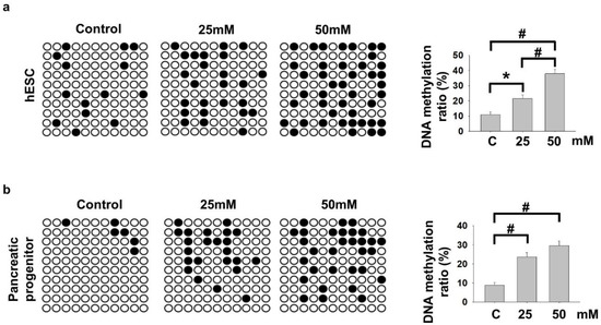 We and others [16,19] have demonstrated the importance of NKX6−2 in regulating pancreatic progenitor differentiations. It was among the hypermethylated genes enriched in cell fate commitment and was down-regulated in PP cells differentiated from hyperglycemia-treated VAL3 (Figure 1c), suggesting potential epigenetic regulation of the gene during pancreatic differentiation. Using conventional bisulfite PCR, it was found that 25 mM and 50 mM glucose culture significantly induced DNA methylation levels of NKX6−2 in the treated undifferentiated VAL3 (Figure 3a). More importantly, the hypermethylation status of NKX6−2 in VAL3 with prior hyperglycemia (25 mM and 50 mM) treatment was maintained after induction of PP differentiation at a glucose level of 13.7 mM (Figure 3b).