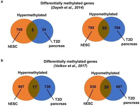 Meta-analysis with dysregulated methylome from pancreatic islets of T2D patients. Venn diagram showing the comparison of hypermethylated and hypomethylated genes between hyperglycemia-treated VAL3 and T2D pancreas from (a) Dayeh et al. [7] and (b) Volkov et al. [20].