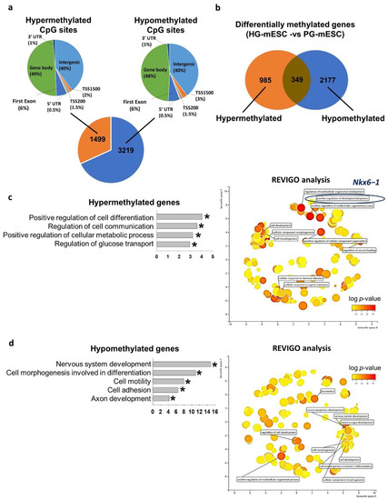 We next compared the genome-wide DNA methylome status of PG-mESC and HG-mESC using reduced representation bisulfite sequencing (RRBS). When compared to PG-mESC, ~70% of the CpG sites were hypomethylated (3219) and ~30% of the sites were hypermethylated (1499) in the HG-mESC. Similar to hESC, the distribution of CpG sites in different genomic regions were similar between hypermethylated and hypomethylated CpG sties (Figure 5a). Concordantly, the number of hypomethylated genes (2177) were higher than that of hypermethylated (985) in the HG-mESC (Figure 5b). We subjected the differentially methylated genes to gene ontology analysis. The hypermethylated genes were enriched for cell differentiation, cell communication, regulation of metabolism and glucose transport (Table 2). REVIGO analysis indicated that the top biological terms clustered were regulation of developmental process and cellular response to organic substance. More importantly, Nkx6−1, the paralog of Nkx6−2 was also found to be hypermethylated in the HG-mESC related to positive regulation of differentiation process (Figure 5c and Table 2). On the other hand, the hypomethylated genes were enriched in nervous system development, cell morphogenesis, cell motility, cell adhesion and axon development (Table 2). REVIGO analysis showed enrichment of terms including nervous system development, cell morphogenesis and locomotion (Figure 5d and Table 2).
