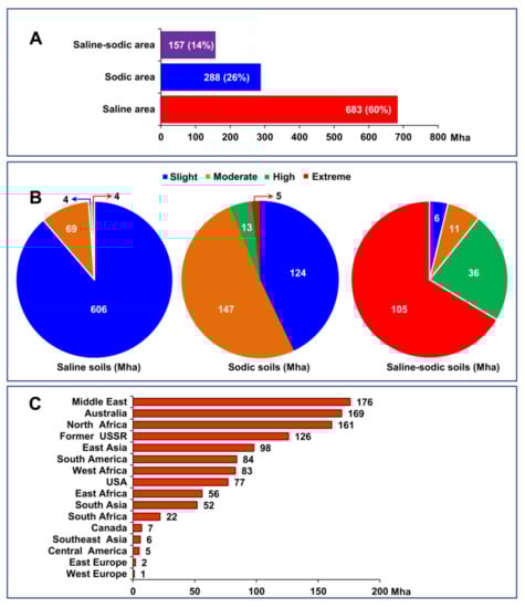 Overview on soil salinization across the world. (A) Salinity-affected soil categories *. (B) Types and severity levels of salinity-affected soils. (C) Salinity-affected soils in different parts of the world *. * Due to rounding, the sum may not resemble the actual statistics of salinity-affected lands. Mha, million hectares.