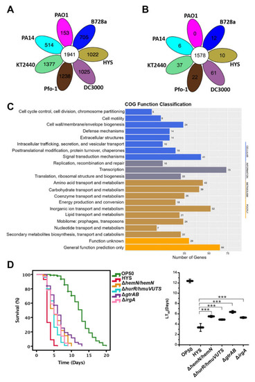 In a previous study, we found that C. elegans fed with P. donghuensis HYS had a significantly shorter lifespan than those fed with P. aeruginosa [15], which indicates that the strain is highly virulence and potentially employs a different virulence mechanism. We first predicted virulence factors of P. donghuensis HYS using the VFDB database. The prediction criteria were a protein sequence identity of more than 40% and a difference in length between protein sequences of less than 30%. As a result, we obtained 440 genes that may be related to virulence in P. donghuensis HYS. Then, we performed comparative genomic analysis of whole genome sequences of the P. donghuensis HYS strain and six model strains of Pseudomonas, which were P. aeruginosa PAO1, P. aeruginosa PA14, P. putida KT2440, P. syringae B728a, P. syringae pv tomato DC3000 and P. fluorescens Pfo-1. The clustering criteria were a protein sequence identity of more than 50% and a difference in length between protein sequences of less than 30%. Cluster analysis of genes and gene families revealed 1022 specific genes and 10 gene families of P. donghuensis HYS (Figure 1A,B). Among the 1022 genes, 584 specific genes were annotated by the Clusters of Orthologous Groups (COG) database. The functional classifications of specific annotated genes were mainly cellular (135 unigenes), information (105 unigenes), metabolism (251 unigenes) and poorly characterized (93 unigenes) (Figure 1C). The 440 virulence genes predicted by the VFDB database were compared with the 584 specific genes obtained by comparative genomic analysis, we screened 42 of 440 virulence genes that are also specific genes of P. donghuensis HYS. Therefore, these 42 genes are specific virulence genes in P. donghuensis HYS (Table S1).