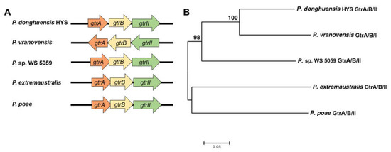Arrangement and phylogenetic analysis of GtrA/B/II in Pseudomonas. (A) Arrangement of GtrA/B/II in five strains. (B) Phylogenetic analysis of P. donghuensis HYS GtrA/B/II using amino acid sequences with MEGA7.0 program.
