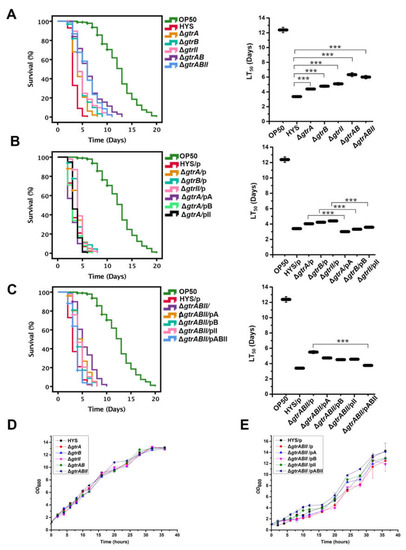 P. donghuensis HYS is highly virulent toward C. elegans. We performed a slow-killing assay to test bacterial virulence against C. elegans. To test the functions of gtrA, gtrB and gtrII in virulence, we constructed single-knockout strains ΔgtrA, ΔgtrB and ΔgtrII, the double-knockout strain ΔgtrAB and the triple-knockout strain ΔgtrABII and performed a slow-killing assay utilizing C. elegans. Survival analysis showed that the lifespan and LT50 value of C. elegans fed the single-knockout strains were approximately 1.5 times greater than those fed the wild-type strain (the LT50 values increased to 4.39 ± 0.13 days, 4.77 ± 0.16 days and 5.09 ± 0.19 days, respectively; n = 3); those fed the double-knockout strain ΔgtrAB and the triple-knockout strain ΔgtrABII survived for approximately twice as long as those fed the wild-type strain (the LT50 values increased to 6.33 ± 0.27 days and 6.02 ± 0.23 days, respectively; n = 3) (Figure 3A).