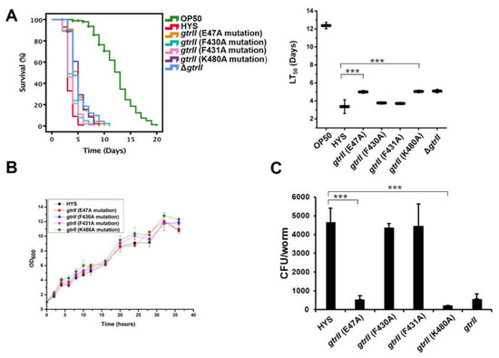 Critical GtrII residues control the virulence function of GtrII in P. donghuensis HYS. (A) The effects of E47A, F430A, F431A and K480A point mutations in P. donghuensis HYS were tested using slow-killing experiments. Approximately 100 synchronized adult worms were added to five plates for each bacterium. Survival curves were plotted in IBM SPSS version 18.0 using the Kaplan–Meier method. (B) Growth curves were also constructed in this killing experiment. (C) P. donghuensis HYS CFU in the gut of nematodes exposed to point mutation strains. Data are presented as the mean ± standard deviation from three independent experiments. *** p < 0.001, Student’s t-test.
