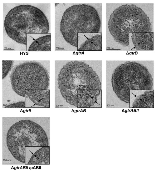 Surface topology of strains revealed by transmission electron microscopy after treatment with ruthenium red. The electron-dense material on the bacterial surface is indicated between the arrows. In ΔgtrA, ΔgtrB, ΔgtrII, ΔgtrAB and ΔgtrABII, the surface material is less compact than HYS.