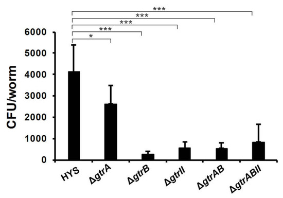 P. donghuensis HYS CFU in the gut of nematodes exposed to deletion mutants. Each symbol represents the average of 6 biological replicates of 10 worms. A comparable initial inoculum was ensured for the exposure of wild-type worms to HYS, ΔgtrA, ΔgtrB, ΔgtrII, ΔgtrAB and ΔgtrABII for 24 h. Data are presented as the mean ± standard deviation from three independent experiments. * p < 0.05 and *** p < 0.001, Student’s t-test.