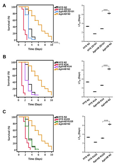 Unlike higher organisms, C. elegans lacks adaptive immune pathways, and only innate immune pathways play an important role in resisting pathogens, oxidative stress and other types of stress [21]. To investigate the worm response to P. donghuensis HYS virulence, we utilized relevant mutants to conduct a slow-killing assay. The mutant worms ZD101, KU4 and KU25 are deficient in the Tir-1, SEK-1 and PMK-1 pathways of the p38 MAPK pathway, respectively. After feeding on P. donghuensis HYS, mutant C. elegans worms were more sensitive and died more quickly than N2 worms. However, when we used the gtrAB deletion mutant as an alternative food source, their viability was significantly improved, illustrating that the strain ΔgtrAB had lower virulence than the wild-type strain when tested as a food source for mutant worms. The LT50 values of mutant worms ZD101 (Figure 7A), KU4 (Figure 7B) and KU25 (Figure 7C) fed P. donghuensis HYS were approximately 49.25%, 64.78% and 33.13% lower than that of N2 worms fed P. donghuensis HYS (the LT50 value decreased from 3.35 ± 0.07 to 1.69 ± 0.04, 1.18 ± 0.03 and 2.24 ± 0.05 days, respectively; n = 3). In addition, when the ΔgtrAB deletion mutant was provided as an alternative food source, the LT50 values of mutant worms decreased by approximately 54.66%, 58.17% and 49.52% compared with that of N2 worms (the LT50 value decreased from 6.24 ± 0.22 days to 2.82 ± 0.05 days, 2.61 ± 0.08 days and 3.15 ± 0.10 days, respectively; n = 3). These percentages suggest a correlation between TIR-1/SEK-1/PMK-1 of the innate immunity p38 MAPK pathway in C. elegans and the gtrAB-related virulence of P. donghuensis HYS.