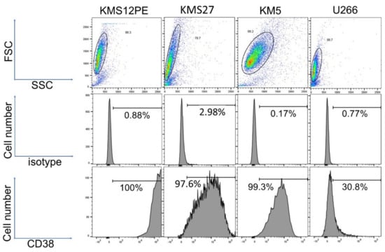 MM cell lines were stained using an Alexa Fluor 647 Mouse Anti-human CD38 antibody (BioLegend, San Diego, CA, USA) for CD38 detection and an Alexa Fluor 647 Mouse IgG2a, κ Isotype Ctrl antibody (BioLegend, San Diego, CA, USA) as a control. The stained cells were analyzed using a BD Fortessa cytometer (BD Biosciences, San Jose, CA, USA). Data were analyzed using the FlowJo software package (v. 10; Tree Star, Ashland, OR, USA).