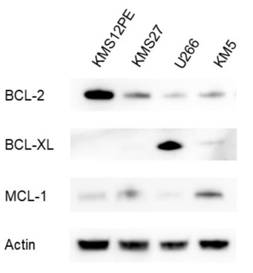 - Punnoose, E.A.; Leverson, J.D.; Peale, F.; Boghaert, E.R.; Belmont, L.D.; Tan, N.; Young, A.; Mitten, M.; Ingalla, E.; Darbonne, W.C.; et al. Expression Profile of BCL-2, BCL-XL, and MCL-1 Predicts Pharmacological Response to the BCL-2 Selective Antagonist Venetoclax in Multiple Myeloma Models. Mol. Cancer Ther. 2016, 15, 1132–1144. [Google Scholar] [CrossRef] [PubMed] [Green Version]