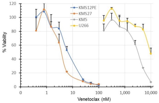 Cytotoxicity of venetoclax to MM cell lines. MM cell lines were treated with venetoclax at the indicated concentrations and cultured for 48 h. The x-axis represents the concentration of venetoclax. The x-axis was formatted to have a base 10 logarithmic scale. The y-axis shows % viability. Viability values on each point is shown as 100% at 0 nM.