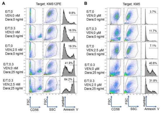 Representative flow cytometric analyses of cytotoxicity by NK cell- mediated ADCC with daratumumab and venetoclax to in MM cell lines using annexin V. The cytotoxicity of combining NK cell mediated ADCC with daratumumab and VEN to in KMS12PE (A) and KM5 (B) cells was investigated by flow cytometric analyses with annexin V. Cells were gated on forward scatter (FSC) and CD56 to remove NK cells, and the gated cells were separated by forward scatter (FSC) and side scatter (SSC). Annexin V+ cells in gated cells separated by FSC and SSC were detected. The percentage of Annexin V+ cells is indicated in each histogram. Cell treatment conditions are indicated on the left side of each panel. E/T: effector/target, VEN: venetoclax, Dara: daratumumab.