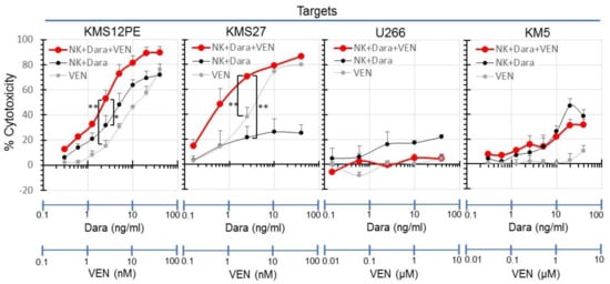 Synergistic cytotoxicity of NK cell mediated ADCC with daratumumab and venetoclax to MM cell lines. Cytotoxicity of NK cell mediated ADCC with daratumumab and venetoclax to MM cell lines, KMS12PE, KMS27, U266 and KM5 was measured by flow cytometry with annexin V. MM cell lines were cocultured with NK cells at effector/target (E/T) ratios: 0.3 with serial concentrations of daratumumab and venetoclax. Cytotoxicity is shown as the mean of three different assays. Red, black, and gray lines indicate the cytotoxicity of NK cells with daratumumab and venetoclax (NK + Dara + VEN), NK cells with daratumumab (NK + Dara), and venetoclax (VEN), respectively. *—differences between groups 0.01< p < 0.05, the Student’s t-test. **—differences between groups p < 0.01, the Student’s t-test.