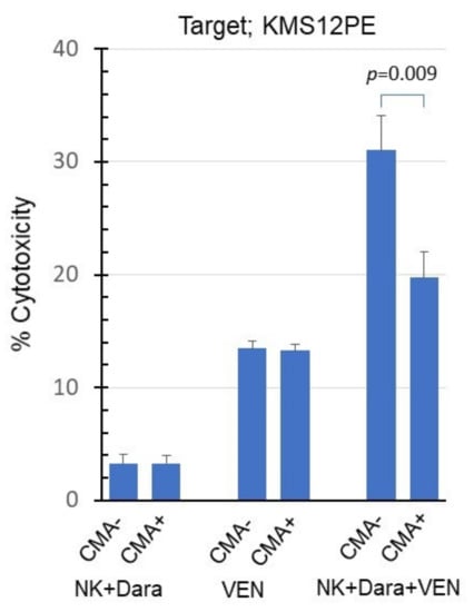 Inhibition of the synergistic cytotoxicity of daratumumab and venetoclax by CMA. KMS12PE was co-cultured with NK cells (E/T = 0.3), daratumumab (2.5 ng/mL), and venetoclax (2.5 nM) in the presence of CMA (10 nM) for 18 h.