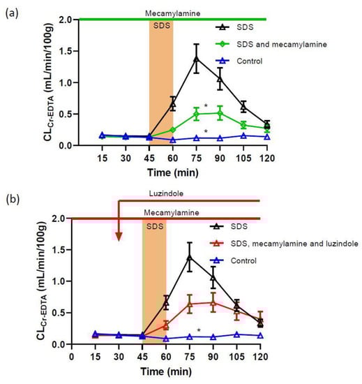 | SDS and mecamylamine | 79 ± 6 | 95 ± 3 | 77 ± 7 * |