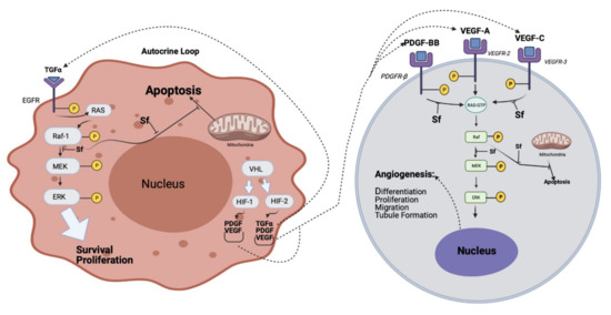 Dysregulation of Signaling through Raf-1 in tumor cells (left panel), endothelial cells, and/or pericytes (right panel) that could result in tumor growth and/or angiogenesis by an autocrine mechanism in HCC, and the effect of sorafenib (Sf), The white arrows indicate the effect on intra-cellular signal molecules or pathways. The dotted arrows indicate the effect on cell membrane receptors (Modified from [12]).
