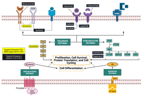 Moreover, Lenvatinib targets the FGF receptor (FGFR1-4), vascular endothelial growth factor receptor (VEGFR1-3), platelet-derived growth factor receptor a (PDFGRa), RET (Rearranged during Transfection), and KIT receptors. Linifanib, a tyrosine kinase inhibitor targeting VEGFR, PDGFR, and ramucirumab, was directed against VEGFR2 and failed in phase III studies in first-line and second-line indications, respectively [38,39,40]. Other molecules such as anti-angiogenic agents (vatalanib, axitinib, and cediranib), c-MET, MEK, and TGF-beta (TGFβ) inhibitors are being tested in early clinical investigations.