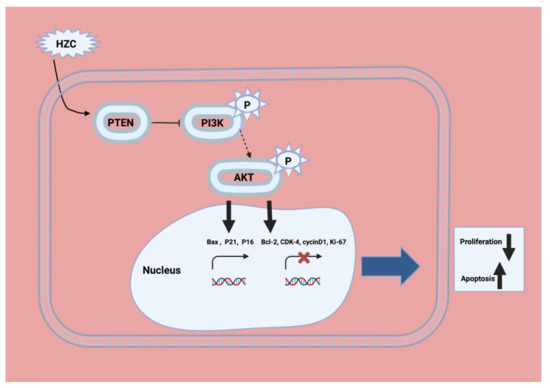 The mechanism of HZC in the HCC treatment model through the PTEN/PI3K/Akt pathway. HZC could inhibit activation of the PI3K/Akt signaling pathway by enhancing PTEN transcription, and then induce apoptosis of HepG2 cells via regulating the expression of apoptosis-related proteins (Modified from [63]).