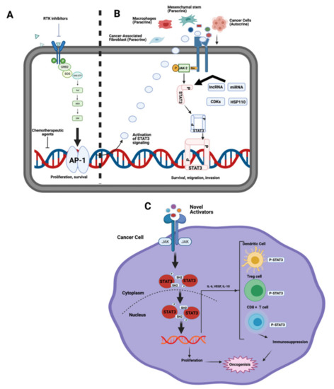 Activation of STAT3 in cancer cells. (A) Inhibition of cancer signaling activates STAT3 pathways. (B) Novel activators of STAT3 secreted by cancer cells, mesenchymal stem cells, cancer‒associated fibroblast cells, or macrophages. (C) Activators of STAT3 promote cancer growth through immunosuppression. STAT3 target genes IL-6, IL-10, and VEGF are regulated by STAT3. These tumor-associated factors activate STAT3 in the immune system (Modified from [72]).