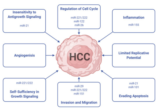Several miRNAs act synergistically to promote HCC through the modulation of multiple cell phenotypes (Modified from [77]).
