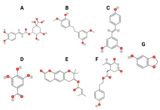 Chlorogenic Acid (A); Gigantol (B); Resveratrol (C); Gallic Acid (D); Decursin (E); Oleocanthal (F); and Sesamol (G).