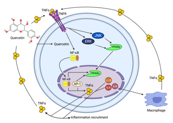 Working model on how quercetin blocks tumor necrosis factor-α (TNFα)‒mediated inflammation (Modified from [98]).