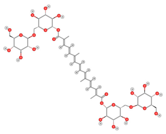 Crocin (Figure 14), is a major carotenoid responsible for saffron’s color; it was described as a potential anti-HCC drug both alone [104,138] and as a targeted drug encapsulated in nanoparticles [139]). Crocin displayed an anti-liver cancer potential through the inhibition of the IL-6/STAT3 signaling pathways [140]. Upon stimulation with cytokines (IL-6 and IL-11) and growth factors (EGF and PDGF), STAT3 is activated and can be phosphorylated prior to binding to DNA. Crocin inhibits the DNA-binding activity of STAT3 in IL-6-stimulated liver cancer cells. It also induces apoptosis in HCC by inhibiting Akt/mTOR activity [141] and activating Poly ADP-ribose Polymerase 1 (PARP-1) cleavage by caspases-9 and 3 [140]. Furthermore, crocin was able to exert an anti-proliferative effect primarily by inactivating the microtubules’ assembly and dynamics [142]. Most recently, an anti-HCC therapeutic capacity of crocin has been patented [143].