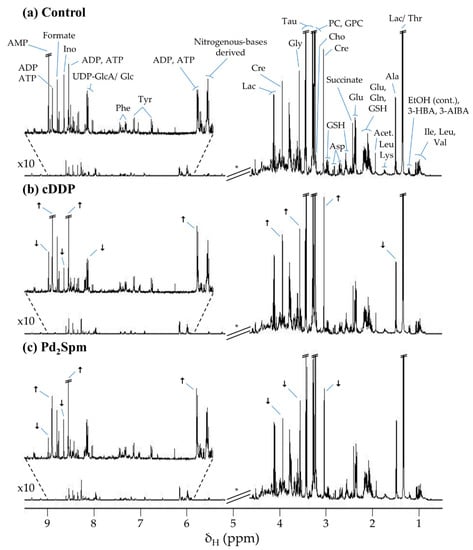 Average 500 MHz 1H nuclear magnetic resonance (NMR) spectra of aqueous extracts of tumors from MDA-MB-231 cell-derived xenograft (CDX) mouse model after exposure to (a) vehicle (phosphate-buffered saline, PBS), (b) cDDP, and (c) Pd2Spm. * Cut-off of water suppression region (δ 4.60–5.20), not considered in the multivariate analysis. The arrows identify visually apparent metabolic variations between treated groups and controls. Abbreviations: 3-letter code for amino acids; 3-AIBA, 3-aminoisobutyric acid; 3-HBA, 3-hydroxybutyrate; Acet., acetate; ADP, adenosine diphosphate; AMP, adenosine monophosphate; ATP, adenosine triphosphate; Cho, choline; Cre, creatine; EtOH, ethanol (contaminant); GPC, glycerophosphocholine; GSH, glutathione (reduced); Ino, inosine; Lac, lactate; PC, phosphocholine; Tau, taurine; UDP-GlcA/ Glc, uridine diphosphate-glucuronate/glucose.
