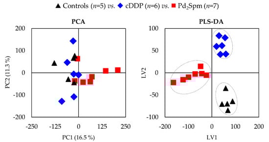 A principal component analysis (PCA) of the spectra of polar extracts indicates an overlap of controls with cDDP-treated tumors (Figure 2, left), whereas a separation tendency is seen for Pd2Spm-treated tumors (Figure 2, left). This suggests that the Pd(II) complex may be exerting a stronger impact on TNBC tumor metabolism. Partial least squares–discriminant analysis (PLS-DA) clearly shows a separation of the three groups (Figure 2, right), which does indicate the distinct effects of the two complexes.