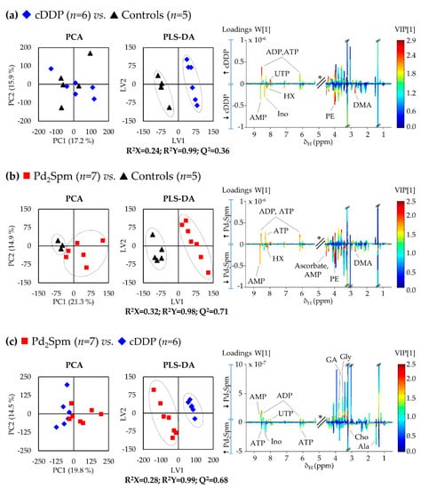 Score scatter plots of PCA (left) and PLS-DA (middle) models obtained for 1H NMR spectra of aqueous extracts of tumors from MDA-MB-231 CDX mouse model, obtained for each pairwise analysis: (a) cDDP vs. Controls; (b) Pd2Spm vs. Controls; and (c) Pd2Spm vs. cDDP. LV1 loadings plots (right) from the correspondent PLS-DA model are colored according to variable importance to projection (VIP) and exhibit the assignment of main peaks (*: cut-off spectral region corresponding to the water resonance). Abbreviations: DMA, dimethylamine; GA, guanidine acetate; HX, hypoxanthine; PE, phosphoethanolamine; UTP, uridine triphosphate. Other abbreviations are defined in the caption of Figure 1.