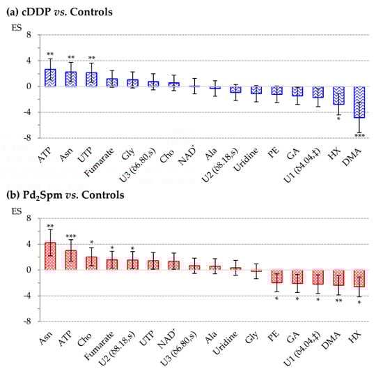 Bar chart illustrating effect size (ES) values [], from maximum to minimum, for (a) cDDP vs. Controls and (b) Pd2Spm vs. Controls. Error bars represent the error associated to the ES calculation []. Asterisks represent the significance level: * p-value < 5 × 10−2; ** p-value < 1 × 10−2; *** p-value < 1 × 10−3 compared to controls. Abbreviations as defined in the captions of Figure 1 and Figure 3, as well as in Table 1; ‡ Partial integration of peak.