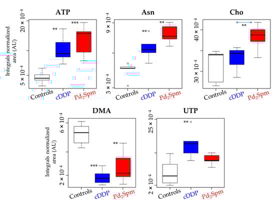 Boxplot representation of metabolites exhibiting variations that remain significant upon false discovery rate correction (a in the Table 1). The box represents the lower and upper quartile (25–75%) with the non-outlier range, the bold line represents the median, and circles (“°”) represent outlier sampls. Asterisks represent the significance level of pairwise comparison with controls (except for Cho, where significance is indicated for drugs comparison, Pd2Spm vs. cDDP): ** p-value < 1 × 10−2; *** p-value < 1 × 10−3. Abbreviations as defined in captions of Figure 1 and Figure 3.