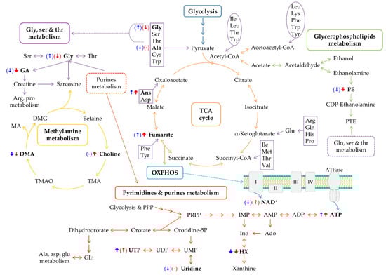The representation of the magnitude and direction of the evolution of the noted metabolite changes (Figure 4) illustrates that, interestingly, each signature comprises the same metabolite players, which, however, differ significantly in magnitude/direction of variation and statistical relevance. Notably, the topmost increased metabolites are in both cases ATP and asparagine, whereas the metabolites showing a larger decrease are (also in both cases) PE, GA, U1, HX and DMA (although in a different order of magnitude).