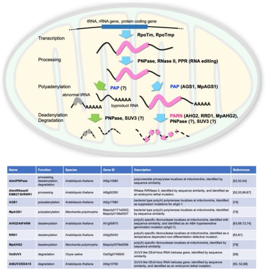 - Levy, S.; Schuster, G. Polyadenylation and Degradation of RNA in the Mitochondria. Biochem. Soc. Trans. 2016, 44, 1475–1482. [Google Scholar] [CrossRef]