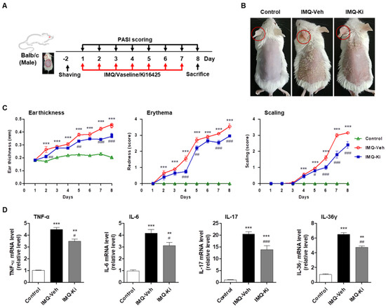 2.1. Ki16425 Ameliorates Skin Symptoms and Inflammation in IMQ-Induced Psoriasis-like Mice