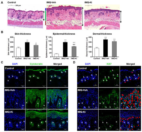 2.2. Ki16425 Decreases Epidermal Thickening and Keratinocyte Proliferation in IMQ-Induced Psoriasis-like Mice
