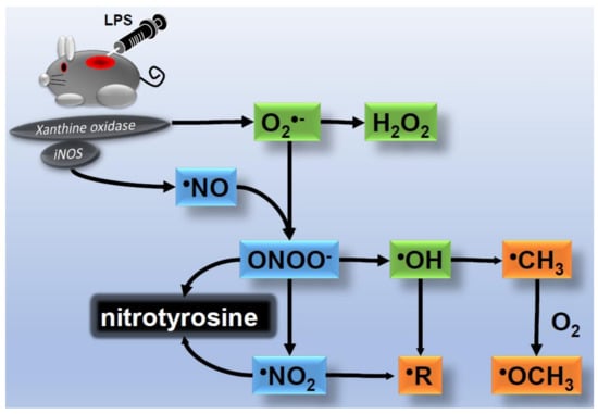 - Nakai, K.; Kadiiska, M.B.; Jiang, J.J.; Stadler, K.; Mason, R.P. Free radical production requires both inducible nitric oxide synthase and xanthine oxidase in LPS-treated skin. Proc. Natl. Acad. Sci. USA 2006, 103, 4616–4621. [Google Scholar] [CrossRef]