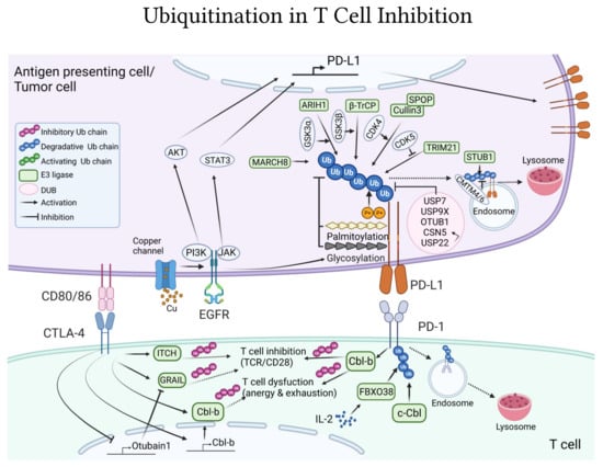 Chicago/Turabian StyleGavali, Shubhangi, Jianing Liu, Xinyi Li, and Magdalena Paolino. 2021. "Ubiquitination in T-Cell Activation and Checkpoint Inhibition: New Avenues for Targeted Cancer Immunotherapy" International Journal of Molecular Sciences 22, no. 19: 10800. https://doi.org/10.3390/ijms221910800