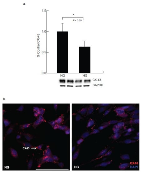 Hyperglycemic condition results in alterations in Connexin 43 expression in cardiomyocytes. Gap junction protein connexin 43 (Cx43) expression was assessed by Western blot analysis as well as by immunohistochemistry in cardiomycytes. (a). Western blot analysis demonstrated a decrease in CX43 expression in the hyperglycemia exposed cardiomyocytes compared to the normoglycemic condition (NG, * p < 0.05). (b) Immunocytochemical analysis also exhibited reduced CX43 expression (red) in CM under hyperglycemic condition compared to cardiomyocytes under normal glucose condition after 24 h of exposure. (Scale bar = 100 µm).