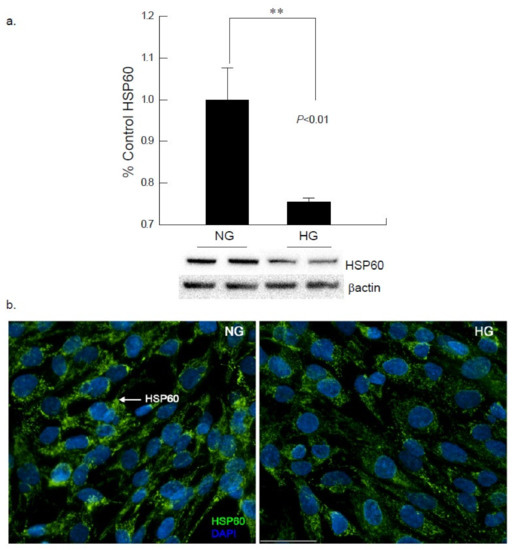 Heat shock protein 60 (HSP60) is a chaperone protein member of the HSP family which typically functions in mitochondria as well as cytosol, membrane and extracellular space, under stress, inflammation and immune mediated or other cellular events. Western blot analysis of HSP60 showed a downregulation of protein ability after a 48-h exposure to hyperglycemia, indicating that mechanisms may be altered as a result of the chronic stress (Figure 3). These findings were confirmed via immunocytochemistry studies, where a decrease in HSP60 was noted in the high glucose conditions as compared to the normal glucose conditions. Further analysis unveiled that heat shock protein 70 (HSP70), involved in inhibition of aggregation by binding to unfolded proteins by preventing further cellular damage, was significantly downregulated (*p < 0.05) after 24 and 48 h of exposure to an elevated glucose (25 mM) environment (Figure S1).
