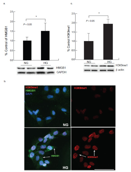 Hyperglycemia induces elevated expression of HMGB1 and H3K9me1 in cardiomyocyte. AC-16 cardiomyocytes revealed that stress mediated high glucose exposure increased expression of histone 3 lysine 9 mono-methylation (H3K9me1) as well as inflammatory mediator HMGB1 (high mobility group box 1). (a) Western blot analysis showed an increase in HMGB1 after 24 h of exposure to high glucose (HG) in comparison to normal glucose conditions (NG; * p < 0.05). (b) Immunocytochemical analysis of cardiomyocytes exposed to high glucose for 24 h showed an increase in the expression of H3K9me1 (red) along with increased inflammatory mediator HMGB1 (green). (Scale bar = 100 µm). (c) Western blot analysis showed an increase in H3K9me1 after 24 h of exposure to high glucose in comparison to normal glucose conditions (NG; * p < 0.05).