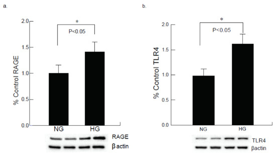 HMGB1 is a non-chromosomal DNA-binding protein, which may release from cardiomyocytes under certain physiological conditions in response to stress. The immunocytochemistry and Western blot studies demonstrated an upregulation of HMGB1 (Figure 4a,b) along with its receptors RAGE and TLR4 (Figure 5a,b), that may lead to damage of CM cells as indicated by the upregulation of other stress-induced markers after 24 h of hyperglycemic exposure.