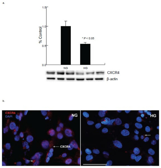 Hyperglycemia alters chemokine receptor CXCR4 expression in cardiomyocytes. (a) Western blot analysis of cardiomyocytes exposed to hyperglycemic condition for 48 h showed reduction in the expression of CXCR4 (* p < 0.05). (b) Immunocytochemical analysis of cardiomyocytes exposed to high glucose (HG) for 48 h showed decrease in the expression of CXCR4 (red). (Scale bar= 100 µm).