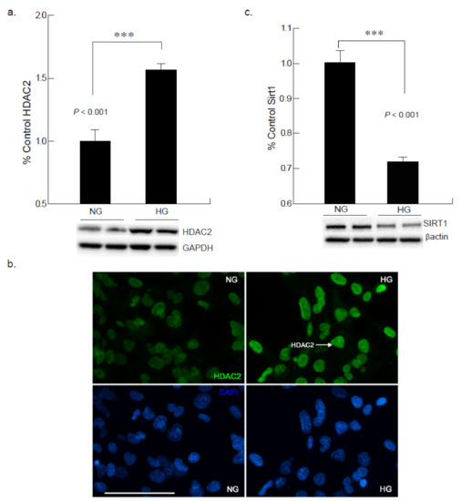 To define whether physiologically-relevant hyperglycemic conditions could further affect class III histone deacetylase, SIRT1 expression, AC16 CM cells were exposed to high glucose (25 mM) media; 48 h of exposure exhibited a decreased expression in SIRT1 levels. SIRT1 is an NAD+ dependent deacetylase which is important for metabolic control; when exposed to hyperglycemic induced stress, a shift in the NADH/NAD+ratio has been observed. Given the possible association between hyperglycemia and inflammation, the results confirm an inverse relationship between SIRT1 expression and hyperglycemic condition. Following a 48-h incubation period in elevated glucose, a significant decrease (***p < 0.001) of SIRT1 was noted (Figure 7c).
