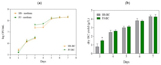 (a) Number of K. xylinus ATCC 53524cells in HS and PJ media and in BC pellicles; (b) yield of BC synthesized by K. xylinus ATCC 53524in HS and PJ media. Data are presented as a mean ± standard error of the mean (SEM). “*” indicates statistically significant difference between HS-BC and PJ-BC. HS—Hestrin–Schramm medium; PJ—potato juice medium; HS-BC—cellulose synthesized in HS; PJ-BC—cellulose synthesized in PJ.