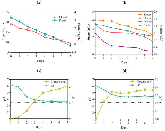 (a) Concentration of glucose and protein in HS medium; (b) concentration of sugars and protein in PJ medium; (c) pH and gluconic acid concentration in HS medium; (d) pH and gluconic acid concentration in PJ medium—all before and during BC biosynthesis by K. xylinus ATCC 53524. Data are presented as a mean ± standard error of the mean (SEM). critical pH value (3.5).