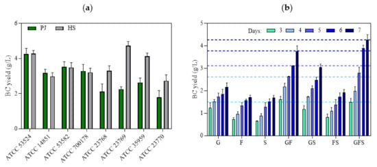 (a) BC yields of different K. xylinus strains in PJ and HS media after 7 days of cultivation; (b) BC yields of K. xylinus ATCC 53524 in HS medium with the addition of sugars at the same concentration as in PJ medium in the following days of cultivation. Data are presented as a mean ± standard error of the mean (SEM): G—glucose; F—fructose; S—sucrose. Horizontal lines in (b) indicate the BC yield of K. xylinus ATCC 53524 in PJ medium in the following days of cultivation.