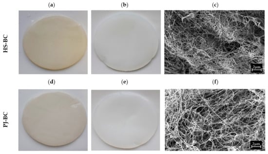 Macromorphological assessment of PJ-BC indicated that it has a homogenous, smooth surface with no visible residues of the culture medium. In fact, the micromorphology was similar to the typical micromorphology of mature BC synthesized in the HS medium (Figure 4a,b,d,e). Likewise, the microstructure of PJ-BC was similar to that of HS-BC (Figure 4c,f) and was consistent with that described in the literature [47]. These observations are particularly important given that the PJ medium used is typically a waste product. A frequent issue encountered with the use of other agro-industrial wastes, such as fruit and vegetable peels or juices (besides the previously discussed issues of pre-processing and/or insufficient nutritional content), is the high content of artifacts, solids, and/or pigments present in the raw substrates. These will then also be present in the medium and then also in the BC obtained.