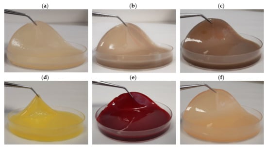 BC obtained from K. xylinus ATCC 53524 using (a) HS and natural ingredients-based media prepared from (b) potato juice, (c) potato peels, (d) orange peels, (e) beetroots, and (f) apples.